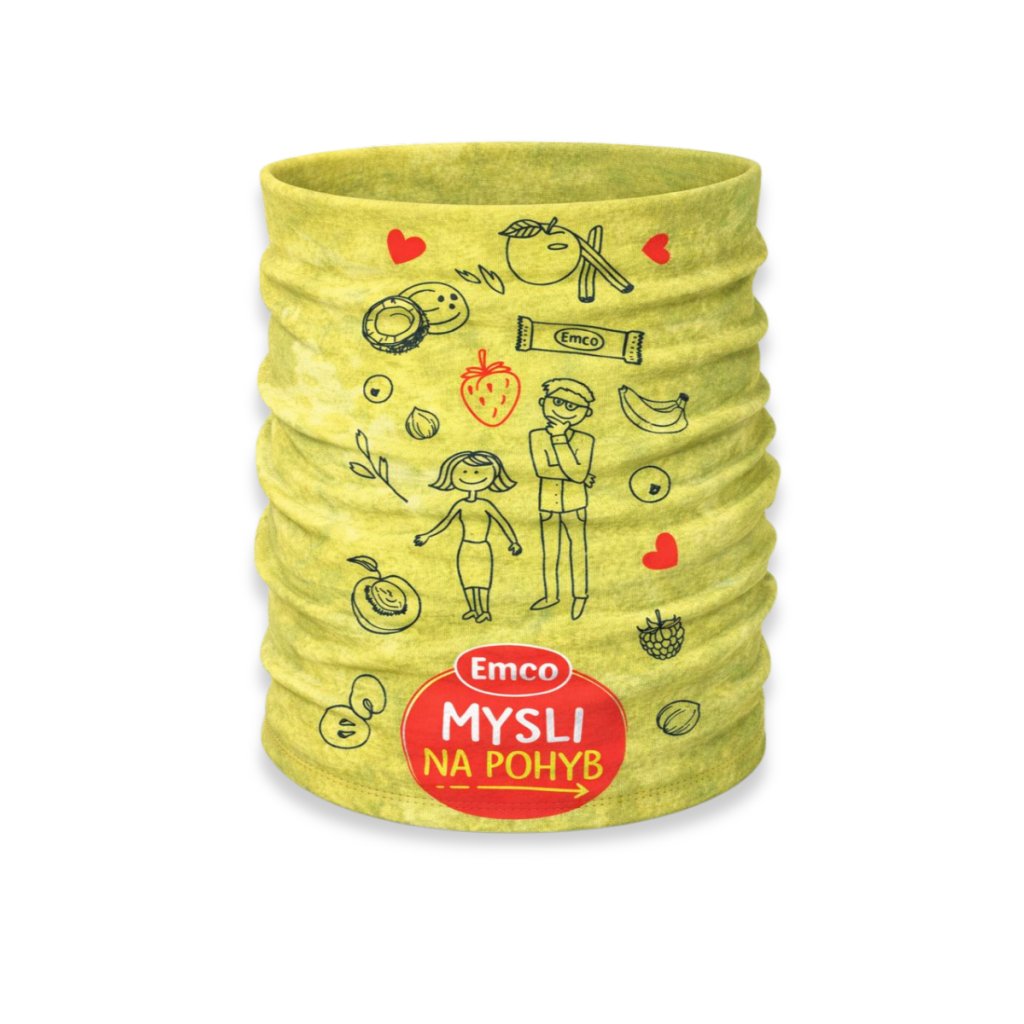 Výrazný multifunkční nákrčník Emco v energickém barevném provedení. Ilustrace ovoce, postaviček a symbolů pohybu doplňuje ikonické logo „Mysli na pohyb“. Skvělá volba pro všechny, kteří chtějí spojit praktičnost s pozitivní náladou a barvami.