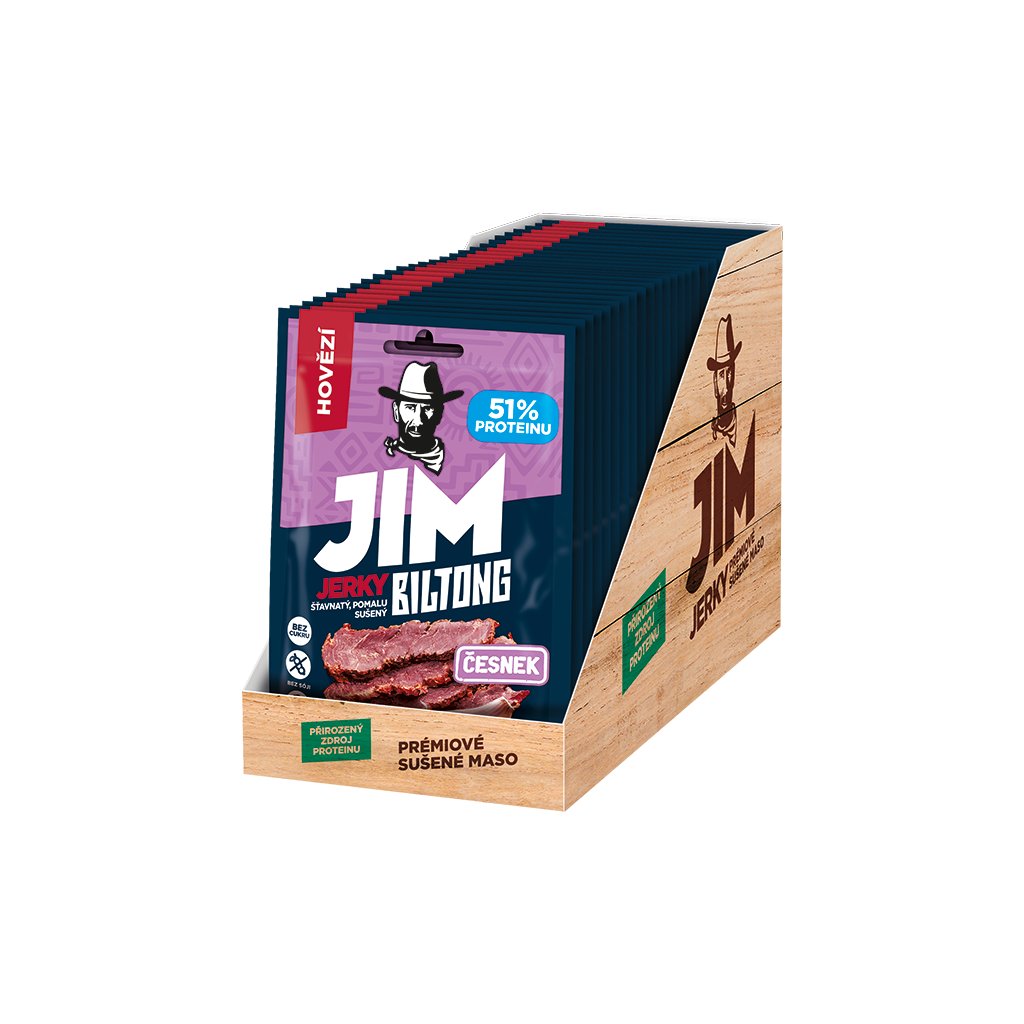 Jim Jerky biltong hovězí česnek v cenově výhodném balení 30 x 20 g