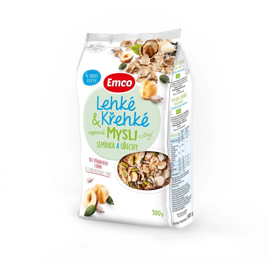Mix 4 druhů vloček mu dodává lehkost a křehkost, lahodné mandle a lískové ořechy příjemně křupou a kombinace slunečnicových a dýňových semínek přináší prospěšné nenasycené mastné kyseliny. Tohle sypané mysli zkrátka potěší všechny vyznavače zdravého životního stylu.