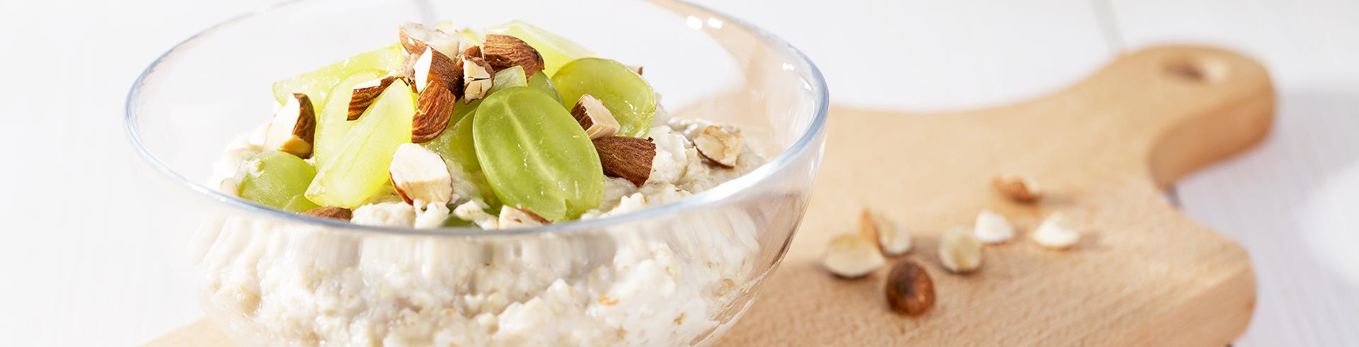 Ovesné vločky zalijeme mlékem a 3 minuty vaříme. Dáme do misky a přidáme nakrájené bobule hroznového vína a nasekané mandle.