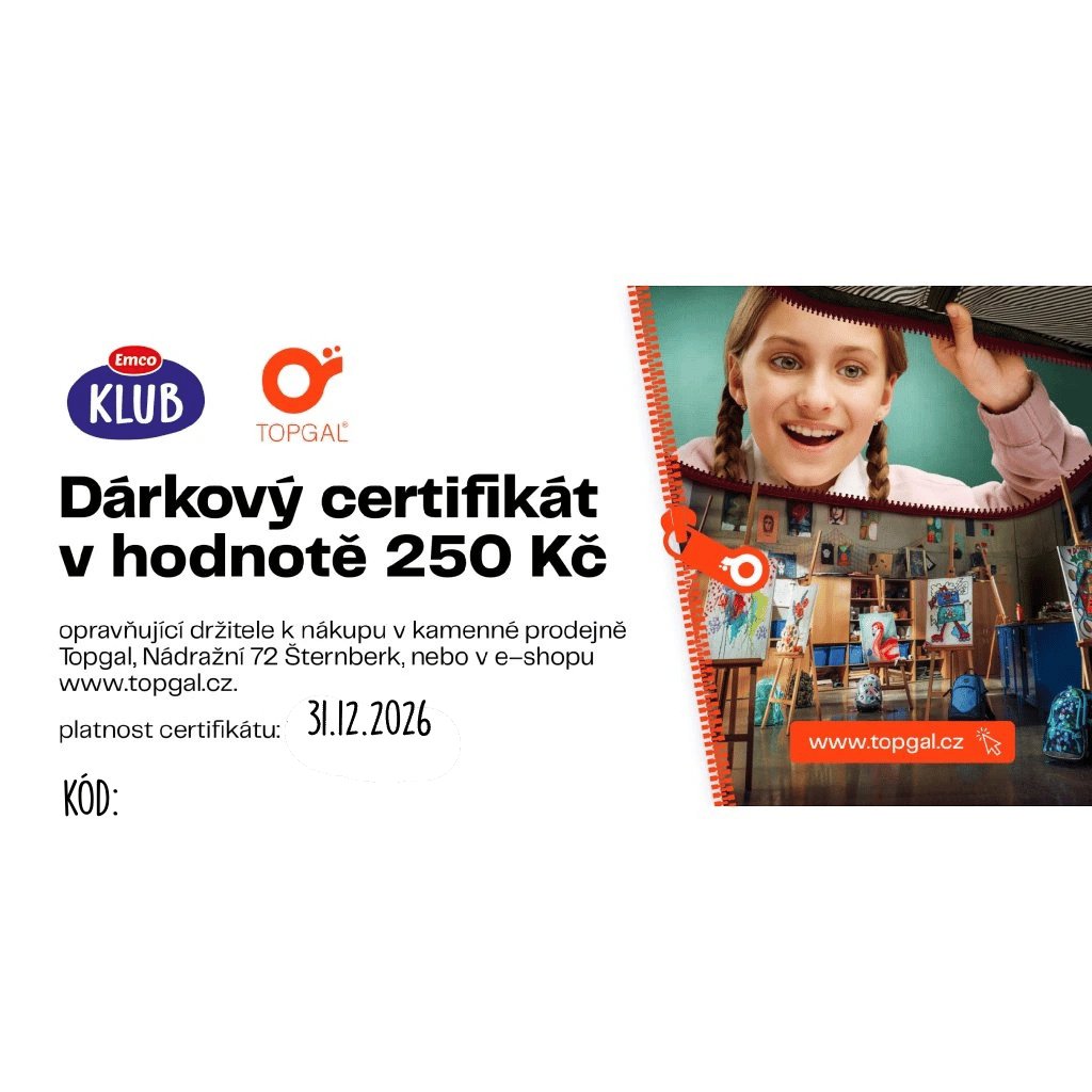 Slevový kupón v hodnotě 250,- Kč platí na nákup libovolného zboží na www.topgal.cz